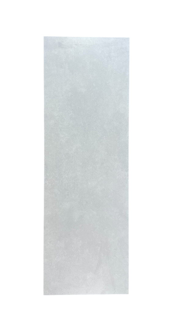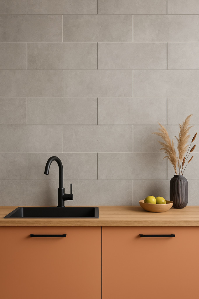Ez a modern konyhai enteriőr tökéletes példája annak, amikor a burkolat határozza meg az egész tér hangulatát. A 30x90 cm-es fali csempe szürkés-betonhatású felülete kortárs stílust sugall, miközben megőrzi a természetes textúrák érzetét. A vízszintesen elhelyezett lapok elegánsan nyújtják a teret, míg a világos fa munkapult és a fekete csaptelep kellemes kontrasztot alkotnak vele. A burkolat egységes, letisztult hátteret biztosít – remek választás modern és ipari stílusú konyhákhoz.