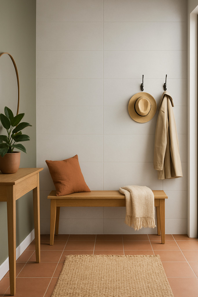 A 30x90 cm-es fali lap visszafogott világos árnyalata elegáns hátteret biztosít az előszoba meleg tónusú bútorainak. A burkolólap vízszintes elrendezése optikailag tágítja a teret, miközben modern és rendezett megjelenést kölcsönöz. Tökéletes választás azoknak, akik stílusos, mégis funkcionális falburkolatot keresnek előszobába, közlekedőbe vagy bármely reprezentatív belső térbe.