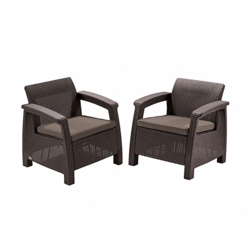Első pillantásra úgy tünhet, hogy a bútorok rattanból készültek, de valójában egy kiváló minőségű müanyagból hoztak létre, amely ellneáll a szélsőséges időjárási viszonyoknak. Lapos párnák, széles kartámaszok és kontúros háttámlák biztosítják a kényelmet a kerti székek használatakor. A bútorgyártó a Curver márka, amely kiváló minőségű kerti bútorokat készít fröccsöntött műanyagból. Egy csoportban működik a közismert és népszerű Keter és Allibert márkákkal Lengyelországban. A korfu bútorokat a vállalat magyar gyárában gyártják. Az egységes szín és a formatervezés a Corfu sorozaton belül lehetővé teszi a Corfu Duo fotelok használatát a sorozat többi készletének kiegészítéseként.