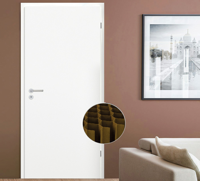 Speciális technológiai eljárással készülő, méhsejt szerkezetű kartonpapír belső kitöltés az ajtólap fa keretszerkezetei közötti szabad területeken.