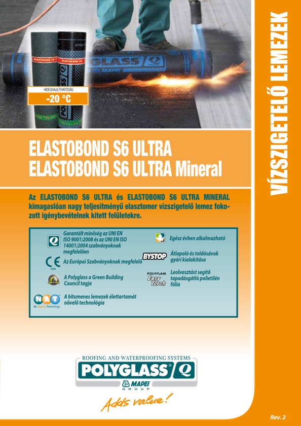 Az ELASTOBOND S6 PREMIUM és ELASTOBOND S6 PREMIUM MINERAL kimagaslóan nagy teljesítményű elasztomer vízszigetelő lemez, amely a legújabb generációs desztillált bitumen bázisú összetevőből és termoplasztikus elasztomer gyantából (SBS) készül megnövelt rugalmasságú, magas minőségű, hosszirányú üvegszállal megerősített poliészter hordozóval. Az alkalmazott hordozóbetét a lemeznek kiváló mechanikai tulajdonságokat kölcsönöz (szakadónyúlás és szakítószilárdság, átszúródással szembeni ellenállás és méretstabilitás). A különleges elasztomer összetevő kitűnő hajlíthatóságot biztosít a lemezeknek alacsony hőmérsékleten is.