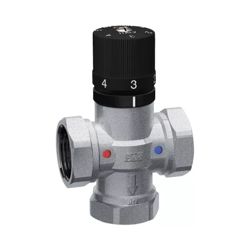 Kézi beállítású termosztatikus keverőszelep padlófűtésre és használati melegvízre. Padlófűtés esetén a szelepet nem szabad 45 °C-nál magasabbra állítani.