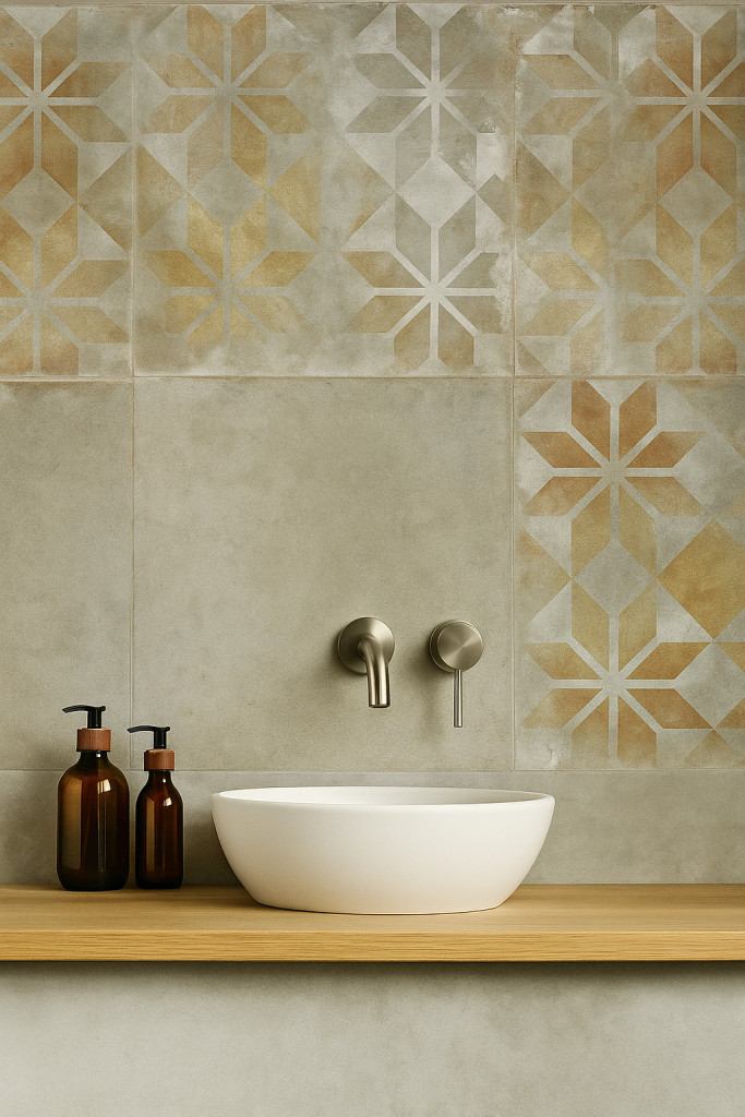 Mivel a termék nem élcsiszolt (rektifikált), és a stílusa rusztikusabb, javasoljuk a legalább 3-4 mm-es fugaszélesség alkalmazását. Ez segít elnyelni a gyártásból eredő minimális méretkülönbségeket, és esztétikailag is jól kiemeli a geometrikus minták ritmusát. A mintában szereplő egyik színhez passzoló (pl. sötétbézs vagy szürke) fuga használata javasolt.