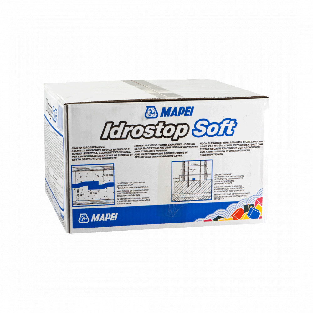 Felhasználási terület: Az Idrostop Soft-ot polgári és ipari építkezéseken használják a szerkezeti illesztések vízszigetelésére. Alkalmazható mind vízszintes, mind függőleges betonfelületeken, hibrid rugalmas ragasztókkal, mint például a Mapeflex MS 45 vagy az Ultrabond MS Rapid.