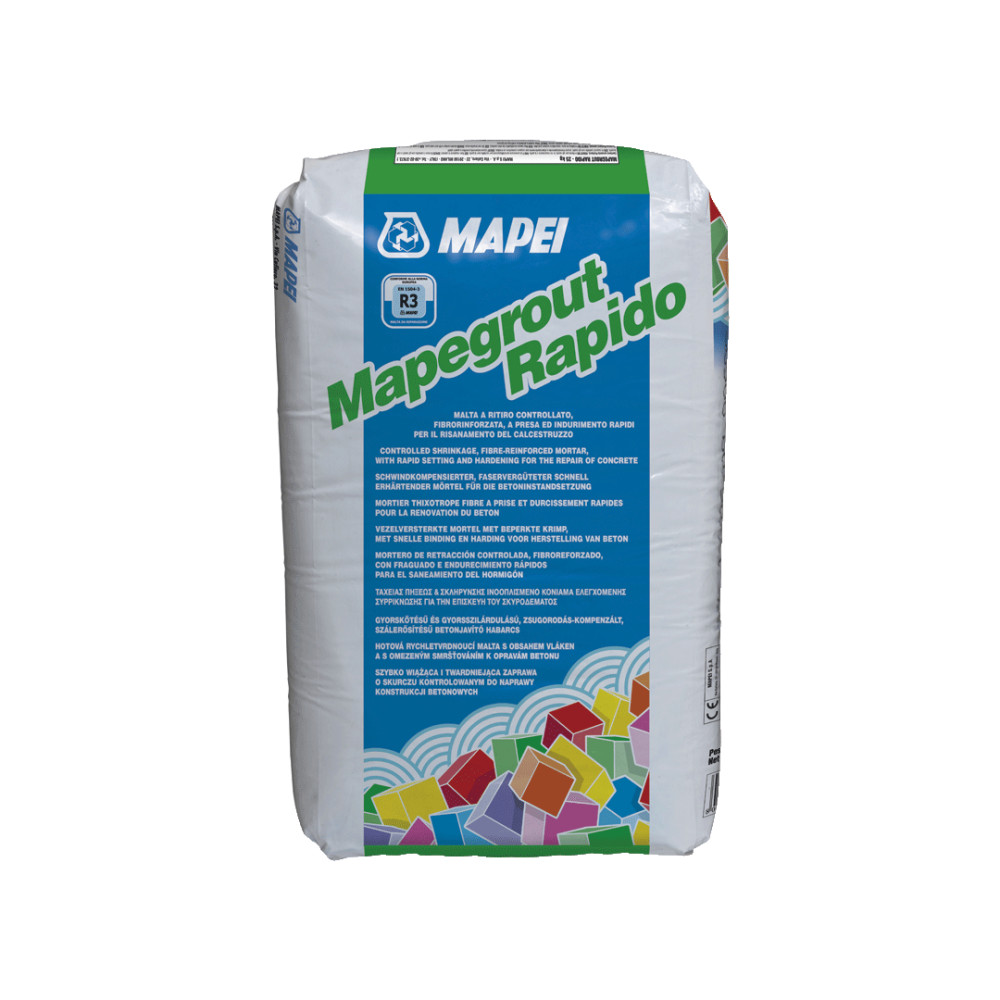 A Mapegrout Rapido megrongálódott betonok felületi javítására használható, például erkélyek homlokfelületein, áthidalók és pillérek élein. A különleges hidraulikus kötőanyagokból, osztályozott szemcseméretű adalékanyagokból, különleges adalékszerekből és szintetikus szálakból álló Mapegrout Rapido elkészítéséhez keverjen be egy 25 kg-os zsáknyi terméket 3,75-4 l vízzel. A Mapegrout Rapido-t az elkészítéstől számított 10 percen belül dolgozza be vakolókanállal a vízzel előzetesen mattnedvesített szilárd és tiszta aljzatra rétegenként legfeljebb 20-25 mm vastagságban. A Mapegrout Rapido +20°C-on 30 percen belül megköt, és a bedolgozás után néhány óra múlva használatba vehető. A Mapegrout Rapido teljesíti az EN 1504-3 szabvány szerint az R3 osztályú szerkezeti habarcsokra előírt alapvető követelményeket.