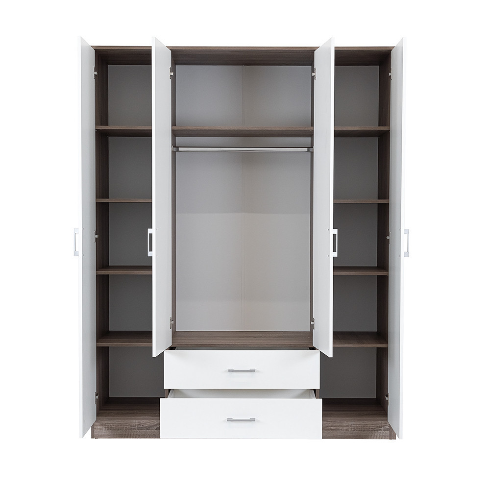 Az elegáns fehér front és a fahatású yorki tölgy korpusz ötvözete tökéletes harmóniát teremt a nappaliba vagy a hálószobába egyaránt. A 205 cm magas, 160 cm széles és 55 cm mély gardróbszekrény ideális választás mindenki számára, aki szeretné rendszerezni ruháit és kiegészítőit.