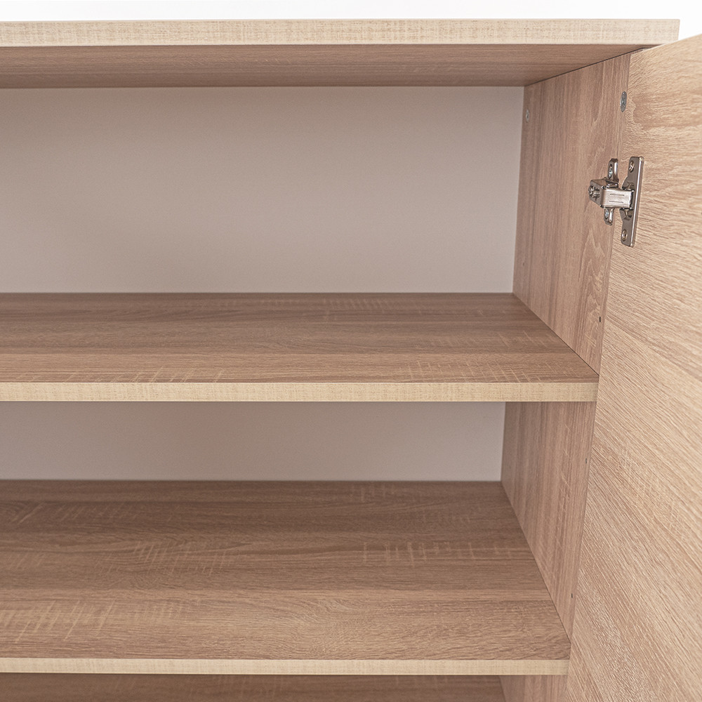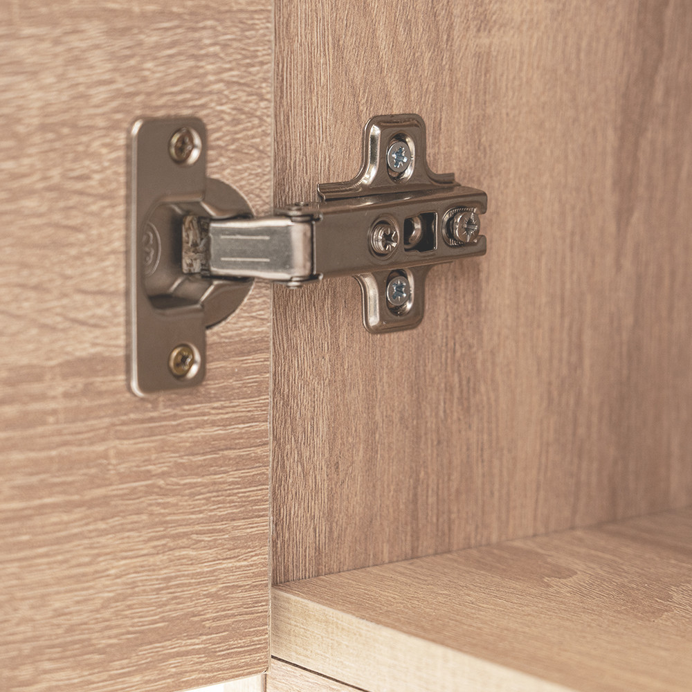A Miami komód sonoma tölgy fronttal és a sonoma tölgy korpusszal letisztultságot és eleganciát kölcsönöz a térnek, miközben a minőségi bútorlap anyaga garantálja a tartósságot és az ellenálló képességet. Méretei - 40 cm mélység, 80 cm szélesség, 92 cm magasság - ideálisak bármely helyiségbe. A komód két szárnyú nyílóajtaja mögött 3 polc található, amelyek tökéletesen alkalmasak ruhák, könyvek vagy akár irodai felszerelések tárolására. A modern dizájnt matt króm hatású műanyag fogantyúk egészítik ki, amelyek még letisztultabbá teszik a megjelenést.