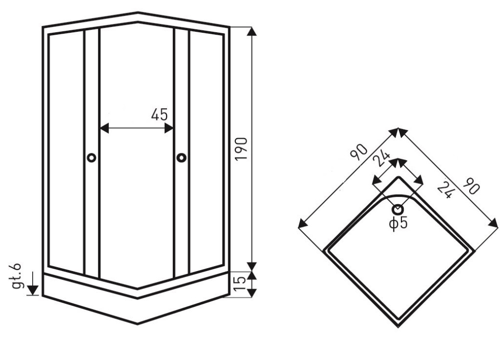 - Méretek: 90 × 90 × 205 cm (kabinház)