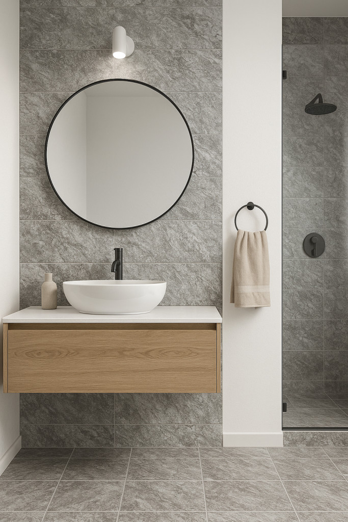Modern, természetes hatású burkolat elegáns szürkés árnyalatokkal. Kiváló választás, ha letisztult és időtálló fürdőszobai megjelenést szeretnél. Harmonizál fa és fém kiegészítőkkel is.