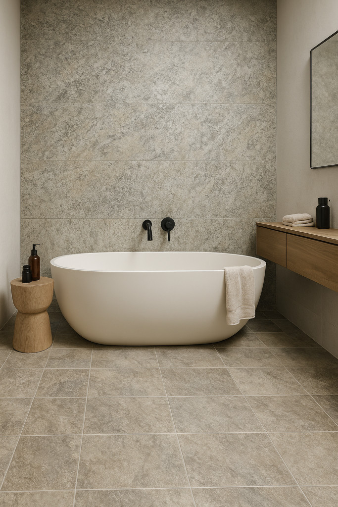 Természetes kőhatású burkolat finom mintázattal és nyugodt színvilággal. Letisztult fürdőszobai enteriőrökhöz ideális. Harmonikusan illeszkedik fa, fekete és fehér elemekhez is.