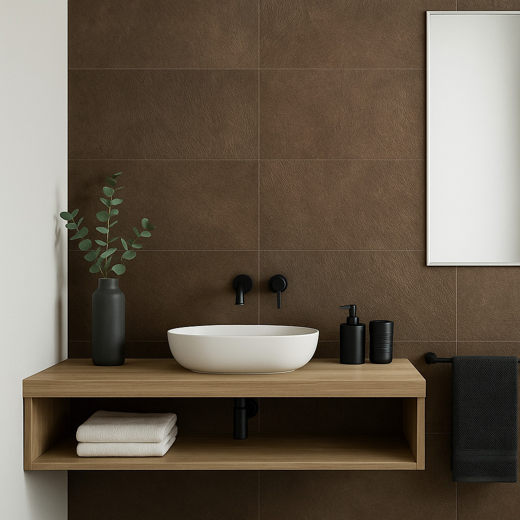 Meleg barna árnyalata és finoman strukturált felülete természetes, mégis modern hangulatot kölcsönöz a térnek. Ez a falicsempe különösen jól mutat fürdőszobákban, ahol a letisztult formavilágú szaniterekkel és fekete kiegészítőkkel párosítva elegáns, harmonikus összhatást teremt. Ideális választás azoknak, akik természetközeli, de karakteres burkolatot keresnek.
