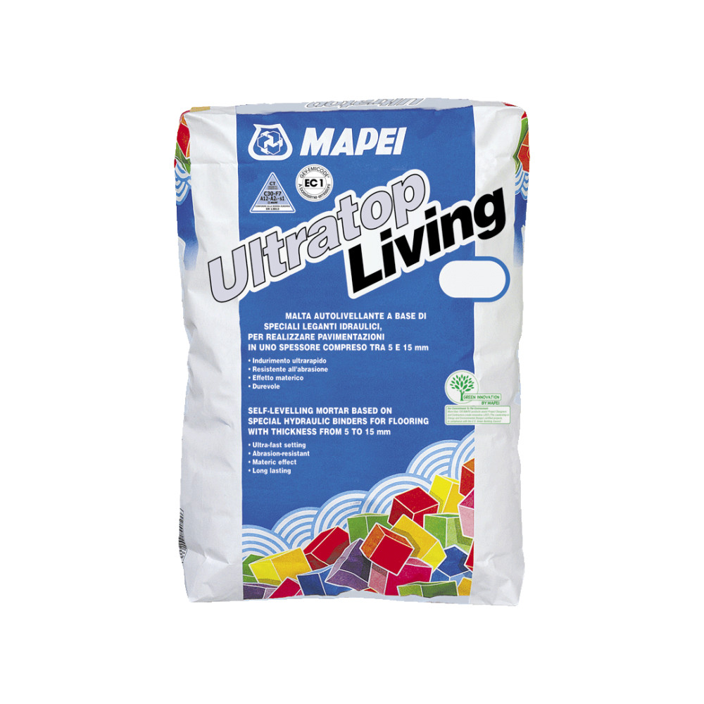 Az Ultratop Living a MAPEI Kutatólaboratóriumaiban kifejlesztett összetételű, speciális gyorskötésű és gyorsszáradású kötőanyagokból, különlegesen osztályozott szemcseméretű kvarchomokból, műgyantákból és különleges adalékszerekből álló világosszürke, fehér, antracit és természetes (gesztenyebarnába forduló bézs) színekben létező por.
