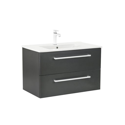A Vario Clam 80 komplett fürdőszobabútor egy stílusos és praktikus választás modern fürdőszobához. Kompakt méretei ideálisak kisebb és közepes méretű fürdőszobákba is, és a fém fogantyú profil patinás hatást, az antracit-antracit színű dizájn elegáns megjelenést kölcsönöz a térnek. A csillapítós fiókzáródás és a felfüggesztett kivitel a kényelmet és könnyű tisztántartást szolgálja, míg a minőségi anyagok hosszú élettartamot biztosítanak.