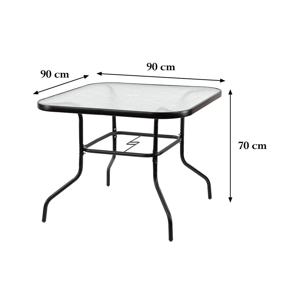 Az Vella fémvázas üveg kerti asztal stílusos és praktikus bútor, amely fémváz és átlátszó üveglap kombinációjával tökéletesen illeszkedik bármilyen kerti vagy teraszos környezetbe. Négyszögletes asztallapja és 90x90x72 cm-es mérete miatt ideális otthoni étkezéshez és szabadtéri összejövetelekhez egyaránt. A fémváz tartóssága és a könnyen tisztítható üveglap ideális hosszan tartó bútordarabbá teszi ezt az asztalt. A Vella tökéletes választás szabadtéri étkezéshez és szabadidős tevékenységekhez, lakossági és kereskedelmi használatra egyaránt ajánlott.