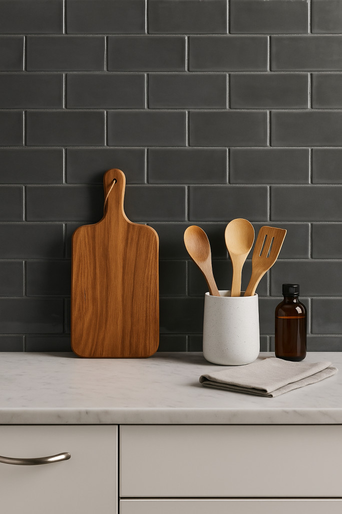 A klasszikus téglaforma új értelmet nyer ebben a sötétszürke, fényes felületű burkolatban. Modern, mégis időtlen megjelenés, amely tökéletesen illeszkedik egy elegáns konyhai hátfalhoz. A finoman csillanó felület kiemeli a formát, míg a meleg fa és világos márvány felületek ellensúlyozzák az árnyalat mélységét.