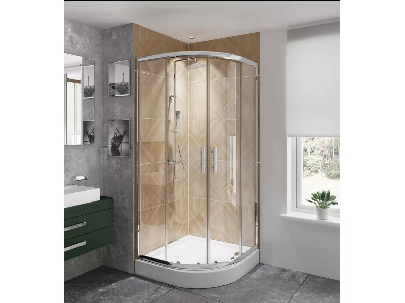 Kivitelezés: krómAlak: félkörívesSzélesség [mm]: 900Hosszúság [mm]: 900Magasság [mm]: 1900Üveg kivitelezése: átlátszóAz edzett üveg vastagsága [mm]: 5Aktív bevonat: IgenOldalméret [mm]: 895
