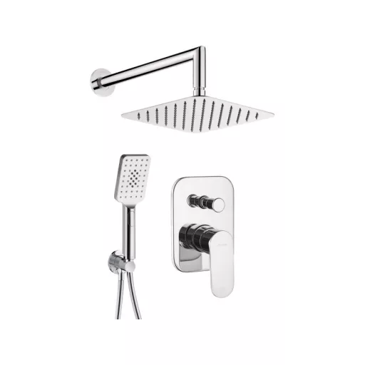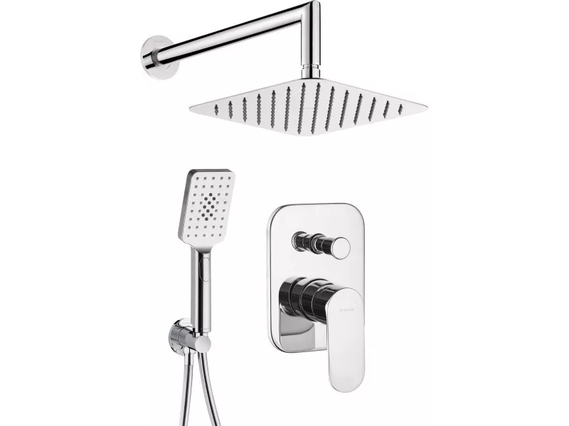 Kivitelezés: krómCsaptelep típusa: keverő, egykarosBeszerelési mód: falsík alattiZUHANYFEJAlak: négyzetAnyag: acél 304, sárgarézSzélesség [mm]: 250Hosszúság [mm]: 250Funkciók száma: 1Áramlások típusai: esőztetőKÉZIZUHANYFunkciók száma: 3Áramlások típusai: esőztető, vízköd, kevert
