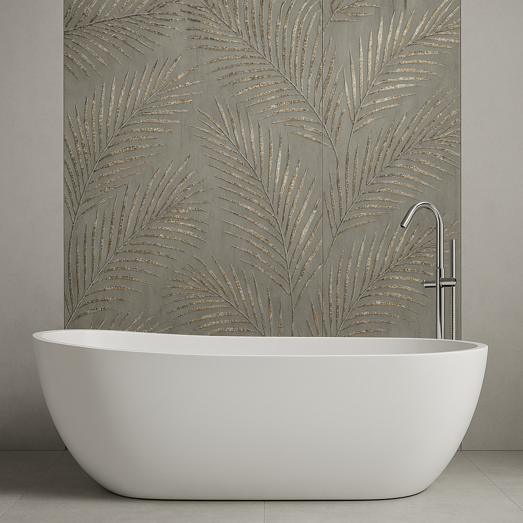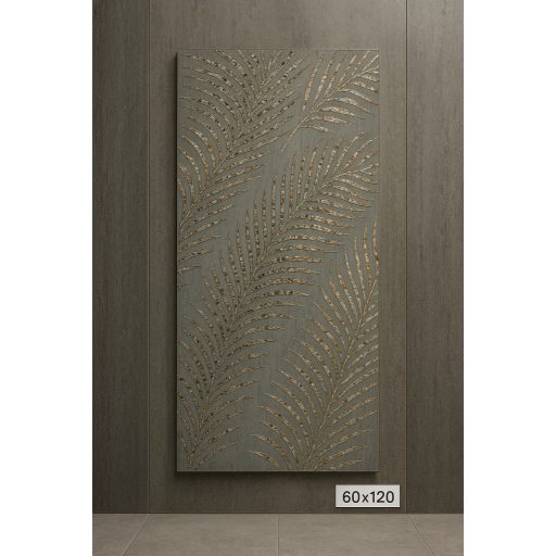 Fedezd fel a Plaster Grey Tessera 60x120 cm-es dekorburkolatot, amely tökéletes választás azok számára, akik nemcsak modern, hanem igazán látványos, prémium hatású burkolatot keresnek otthonukba vagy üzlethelyiségükbe. Ez a különleges rektifikált gresporcelán lap lenyűgöző pálmalevél mintázattal és mozaikszerű, fémesen csillogó részletekkel rendelkezik, amelyek arany, bronz és ezüst árnyalataikkal valódi exkluzivitást kölcsönöznek a térnek.