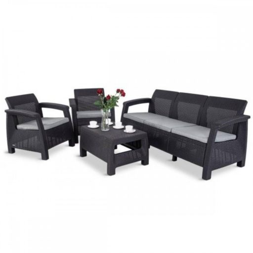 A Corfu Love Duo kerti bútor szett bármilyen kertben, teraszon vagy nagyobb erkélyen tökéletesen mutat. Ez az összeállítás nemcsak rendkívül stílusos, hanem kényelmes és tartós is. A bútorok könnyű felépítésüknek köszönhetően könnyen mozgathatók. A szettben egy kanapé, két kényelmes fotel és egy asztal kapott helyet. A kanapé nagy szélessége miatt elfeküdhet rajta és még aludhat is rajta a kedvenc fája alatt. A fotelekben nyugodtan olvashatja kedvenc régényeit míg az asztalon kényelmesen elfér minden amire a kint töltött idő alatt szüksége lehet.
