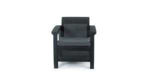 A Corfu Set Max kerti bútor fröccsöntött műanyagból készül - néhány üzletben szereplő információkkal ellentétben ez nem technorattan, hanem egy anyag, amely vizuálisan hasonlít rá.