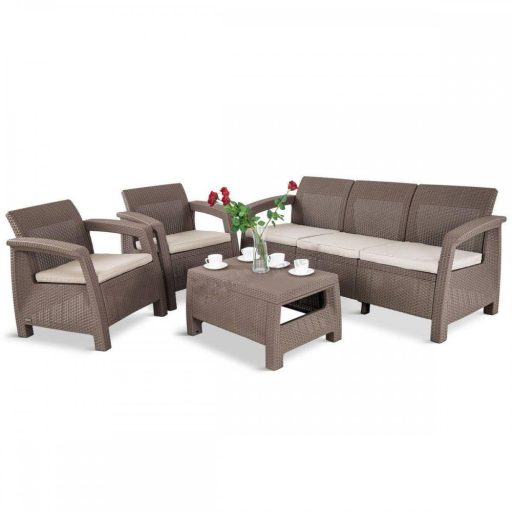 A Corfu Love Duo kerti bútor szett bármilyen kertben, teraszon vagy nagyobb erkélyen tökéletesen mutat. Ez az összeállítás nemcsak rendkívül stílusos, hanem kényelmes és tartós is. A bútorok könnyű felépítésüknek köszönhetően könnyen mozgathatók. A szettben egy kanapé, két kényelmes fotel és egy asztal kapott helyet. A kanapé nagy szélessége miatt elfeküdhet rajta és még aludhat is rajta a kedvenc fája alatt. A fotelekben nyugodtan olvashatja kedvenc régényeit míg az asztalon kényelmesen elfér minden amire a kint töltött idő alatt szüksége lehet.