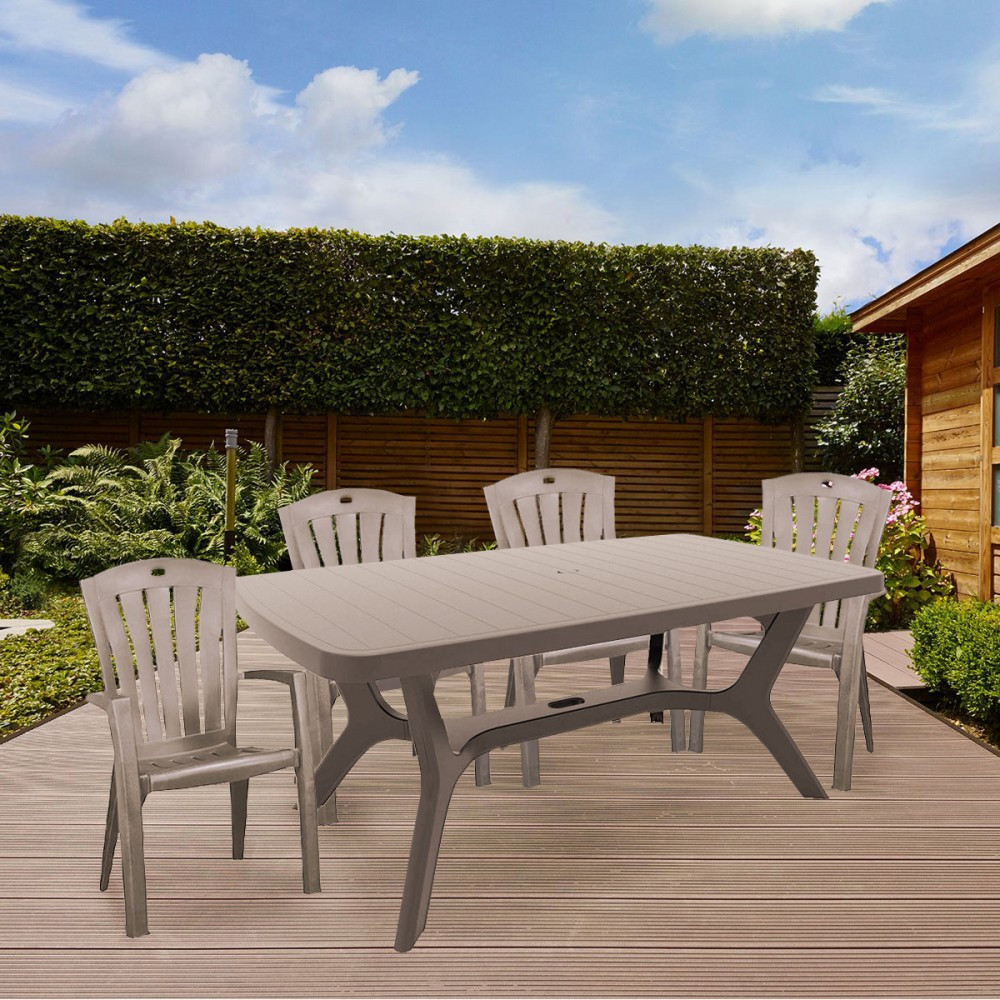 A műanyag felület remekül ellenáll a mindennapos igénybevétel során keletkező erőhatásoknak és az időjárási elemeknek, napfénynek, esőnek, UV-sugárzásnak egyaránt. Hosszú éveken keresztül is meg tudja őrizni az eredeti szépségét. A széles, ovális formájú asztalfelület körül kényelmesen elfér 4 vagy akár 6 személy is.