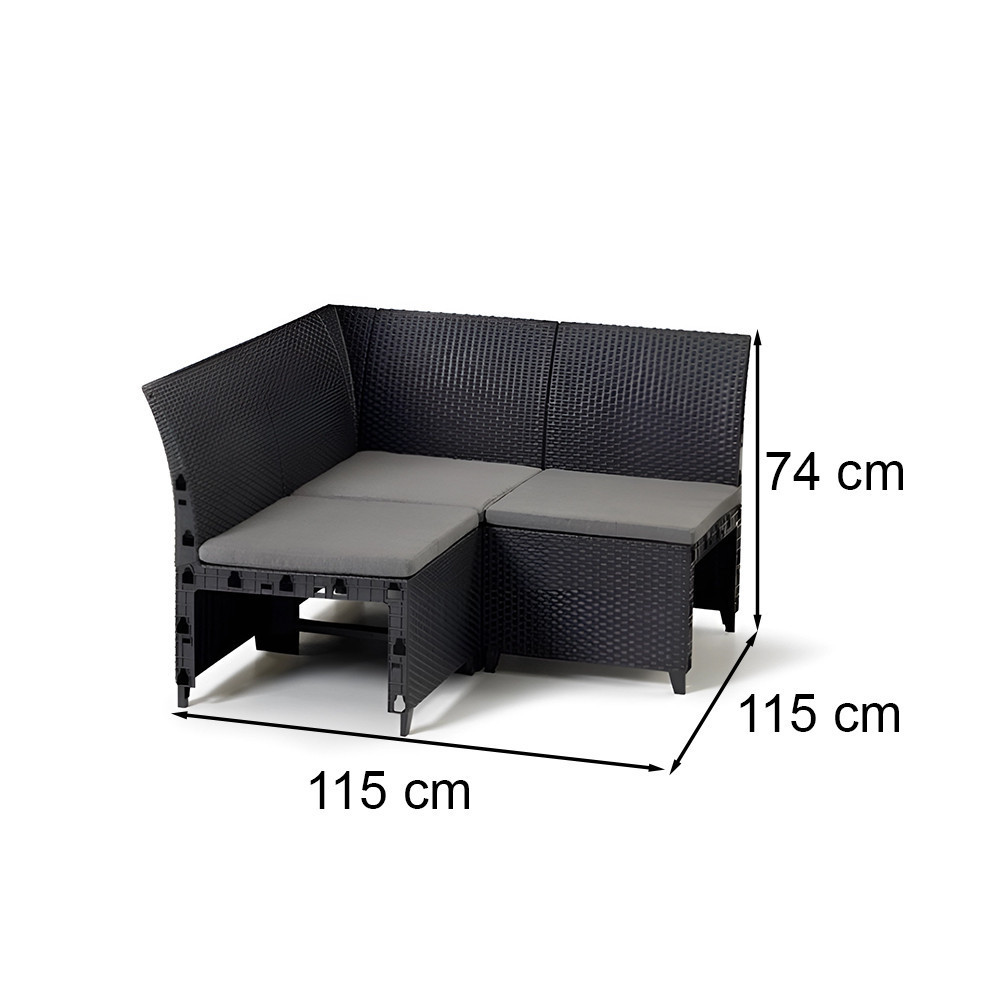 A 115 cm x 115 cm és 74 cm magasságú Rosalie Sarok Elem tökéletesen illeszkedik a modern kerti bútorszettekhe. Segítségével a kanapé méretét a személyes igényeknek megfelelően alakíthatod.