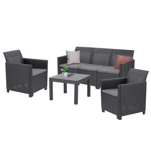 A fotelek és a kanapé kialakítása megfelelő háttámaszt biztosít, a szürke ülőpárnák pedig gondoskodnak a kényelmes pihenésről a szabadban.