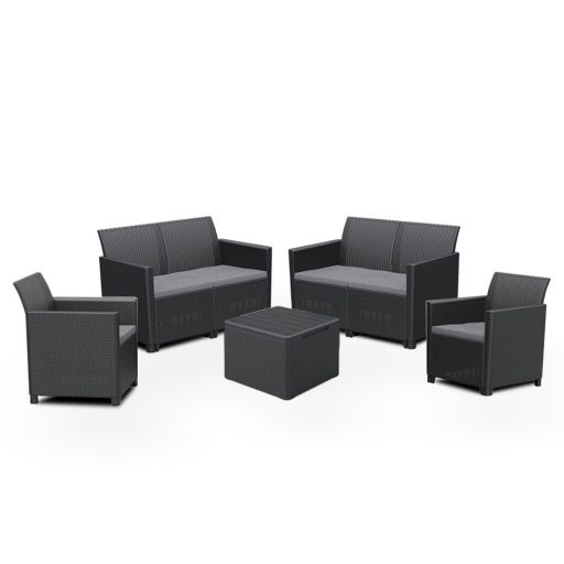 A grafit színben kapható kerti bútor szett könnyű, egyben tartós vázszerkezettel büszkélkedik. Mindennek tetejében roppantul könnyen tisztítható minden egyes eleme, így pillanatok alatt makulátlanná varázsolható az összkép. A grafit árnyalatban elérhető szetthez szürke párnák társulnak, melyek a maximális kényelmet hivatottak borítékolni, a divatos és szemre való megjelenés mellett. A bútorok erős és tartós műanyagból készültek. Az erős, tartós kialakítás nagyfokú megbízhatóságot jelent a gyakorlatban és azt, hogy a bútordarabok kivétel nélkül hosszú élettartamot biztosítanak, az örömteli, nyári napokat fűszerező használaton kívül, ami a fenti pozitívumoknak hála alap.