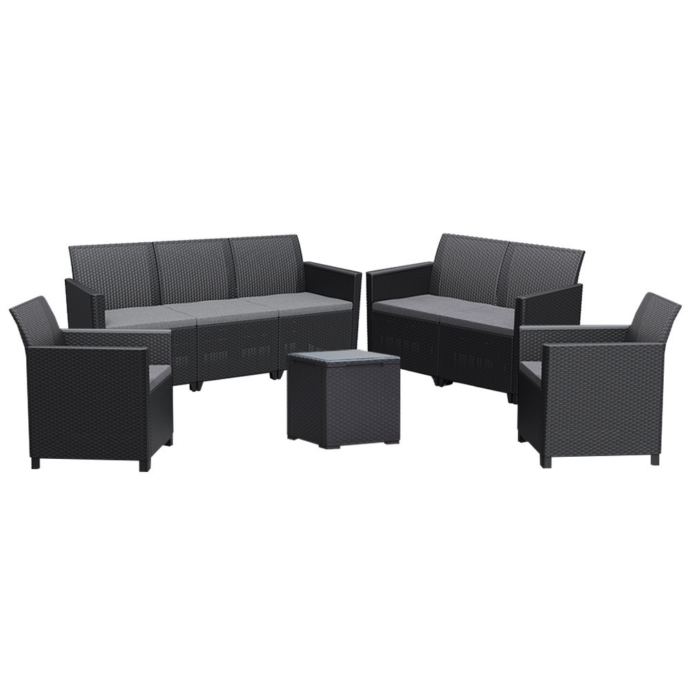 Ez a Grafit színű rattan hatású kerti bútor szett két fotellel, egy 3 személyes kanapéval, 2 személyes kanapéval és egy tárolós asztallal rendelkezik, amelyeket időjárásálló műanyagból készítettek, így nem kell aggódnod a UV sugárzás hatásaitól sem. A fotel magassága: 74 cm, szélessége: 63 cm, hossza: 65 cm. A fotel és a kanapé párnával rendelkezik, mely kényelmessé teszi és színben passzol a bútorhoz. Az asztal magassága: 37 cm, szélessége: 37 cm, hossza: 37. Az asztal több funkciós, így a tároló részében elrejtheted a kerti eszközöket.