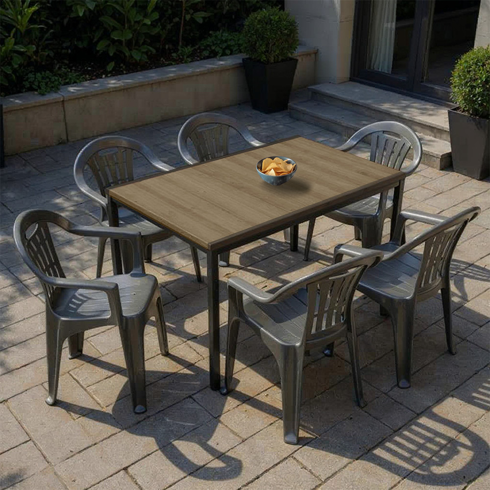 A hűvös grafit székek a valósághű rattan textúrával modern, mégis otthonos hangulatot teremtenek. Ehhez társul a kőris árnyalatú, fa-hatású asztallap, amely elegáns kontrasztot ad; bármilyen stílusú kertben, erkélyen vagy vendéglátó-teraszon lenyűgöző látvány.