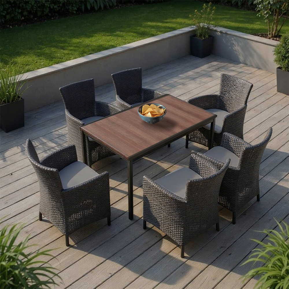 A Nadia 6+1 kerti garnitúra tökéletes választás azoknak, akik szeretnének egy elegáns, mégis ellenálló kültéri bútor szettet, ahol a dizájn és a funkcionalitás kéz a kézben jár. A faerezetes felületű, időjárásálló Porto 160 asztal dió színben és a párnás Iowa fotelgrafit színben harmonikus és igényes összhatást alkot, amely bármilyen kertben vagy teraszon megállja a helyét.
