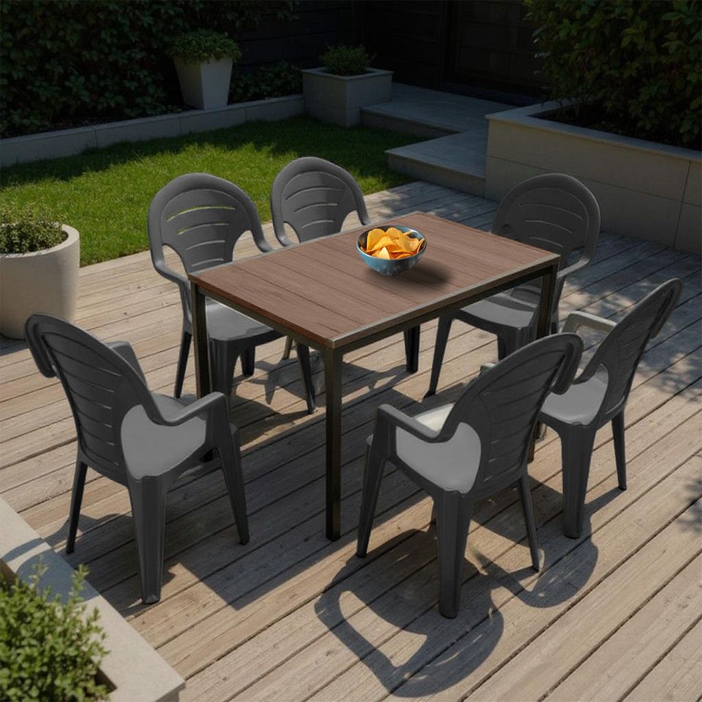 A Siena 6 + 1 kerti szett asztallapja – a Porto 160 modell – DecoCoat™ eljárással készült, fa?hatású polimerből. Ez a speciális, UV-stabilizált műanyag nem szívja magába a vizet, nem vetemedik, és a nyári forróság vagy a téli fagy sem tesz benne kárt. Az asztallapot egy porszórt, korrózió?álló fémváz merevíti, így egyszerre kapod meg a természetes megjelenést és az acélos tartósságot.
