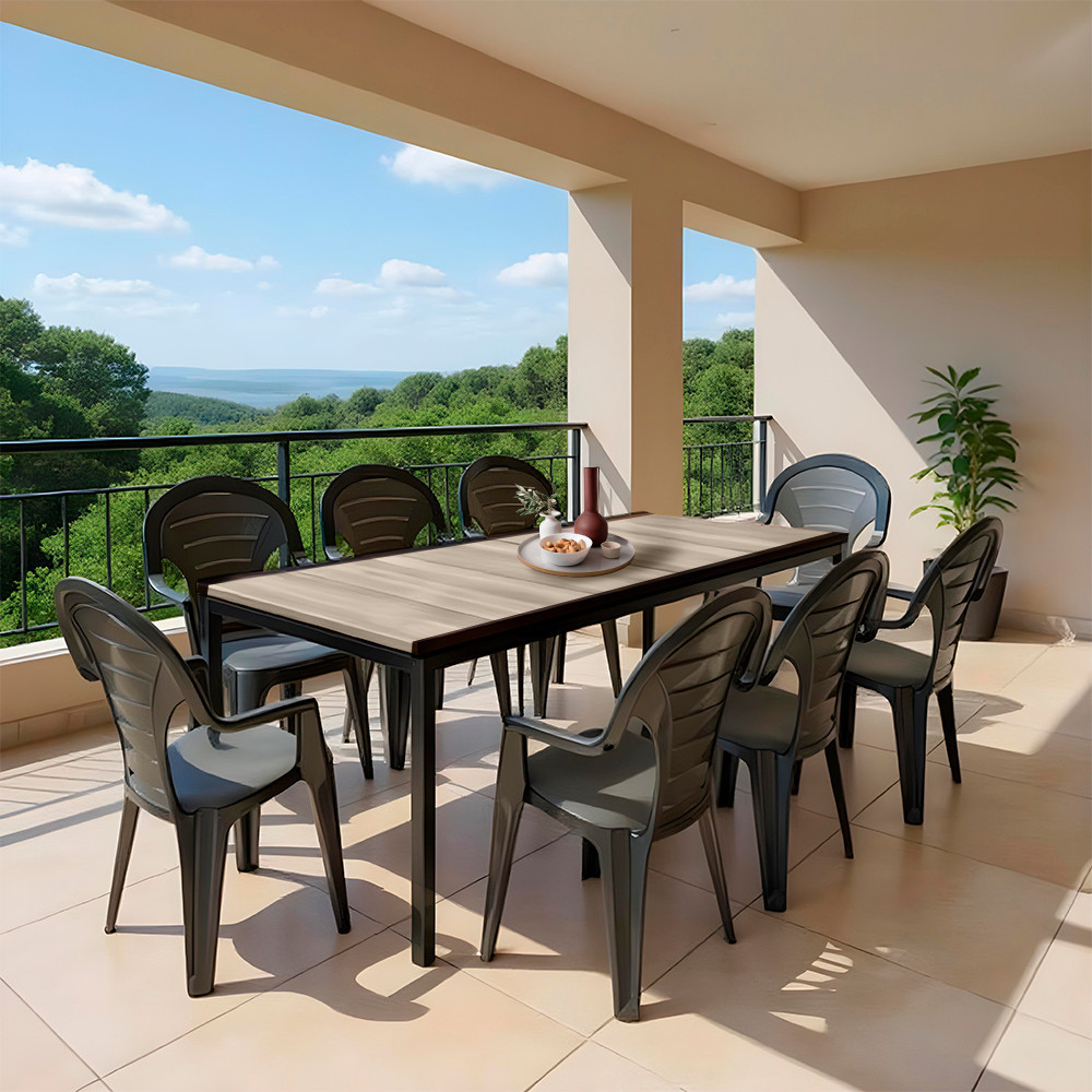 A meleg kőris tónusú asztallap és a letisztult grafit székek elegáns, kortárs megjelenést adnak. Legyen a teraszod skandináv, mediterrán vagy ipari hangulatú, a Lagos Large kifinomult középponttá válik.