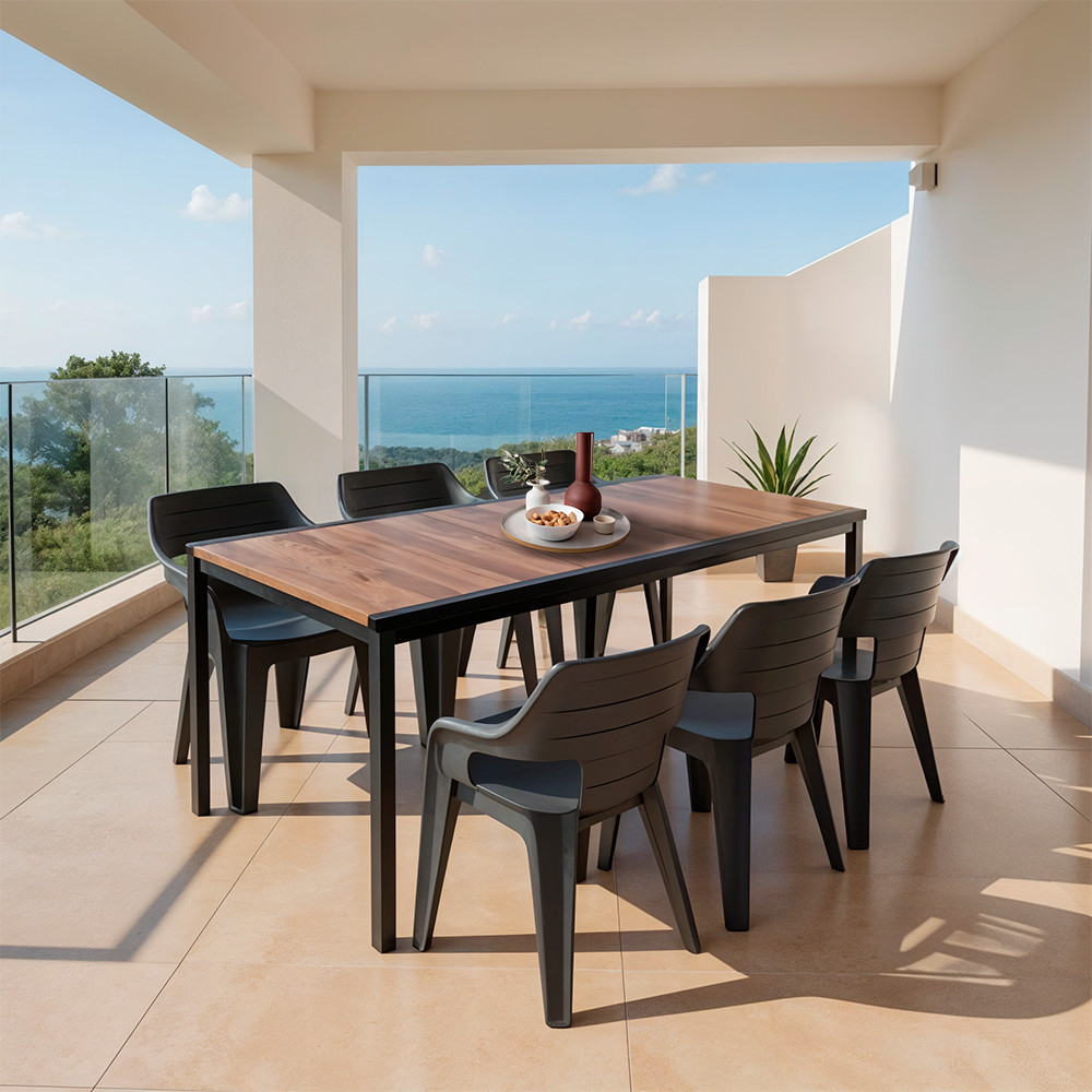 Keter Ravello Large 6 + 1 kerti garnitúra – dió asztallap & fekete rakásolható székek
