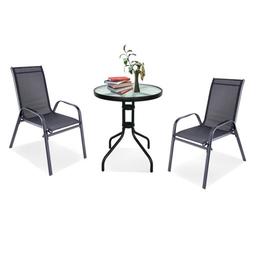 A modern kivitelű kerti bútorkészlet egy kerti üveglapos asztalt és 2 karfás széket tartalmaz, melyek teherbírása 120 kg. A bútorokat 2 fő számára tervezték. A székek és az asztal lábazata fémből készül. Az asztallap 5 mm-es edzett üvegből készült, amely ellenáll a kisebb karcolásoknak. Az textilén szék ülésanyaga ellenáll az időjárási viszonyoknak. Előnye az ergonómikusan profilált ülés és karfa, amelyek tehermentesítik a vállakat pihenés közben.