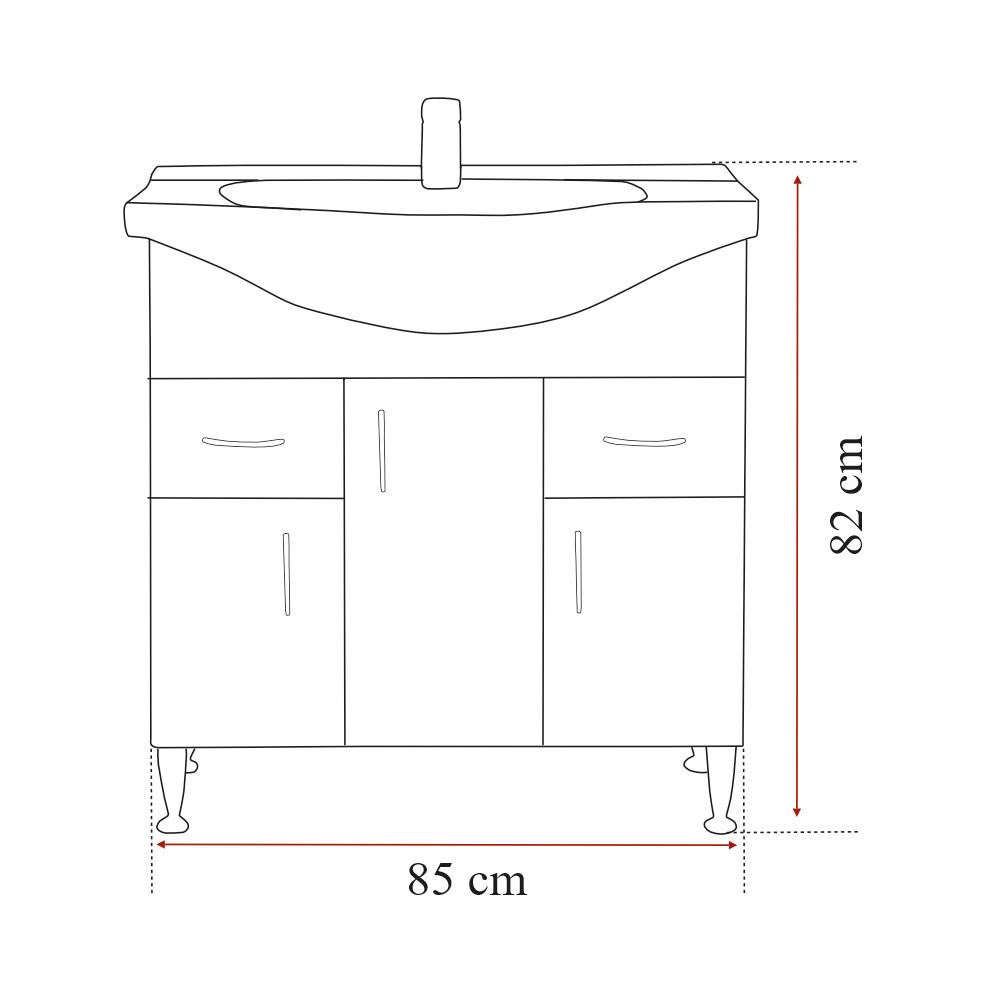A fürdőszobabútor kevés helyet foglal viszont tágas alsó szekrénnyel és tükörrel (világítás nem tartozék) rendelkezik ahol kényelmesen elférnek a fürdőszobai pipere eszközök. Kevés helyigénye miatt kisebb fürdőszobák berendezésére is alkalmas, például panel lakásokban. A termék magas minőségű bútorlapból készül és színben passzoló élzárókkal van ellátva. A fürdőszoba bútor mosdóval együtt kapható.