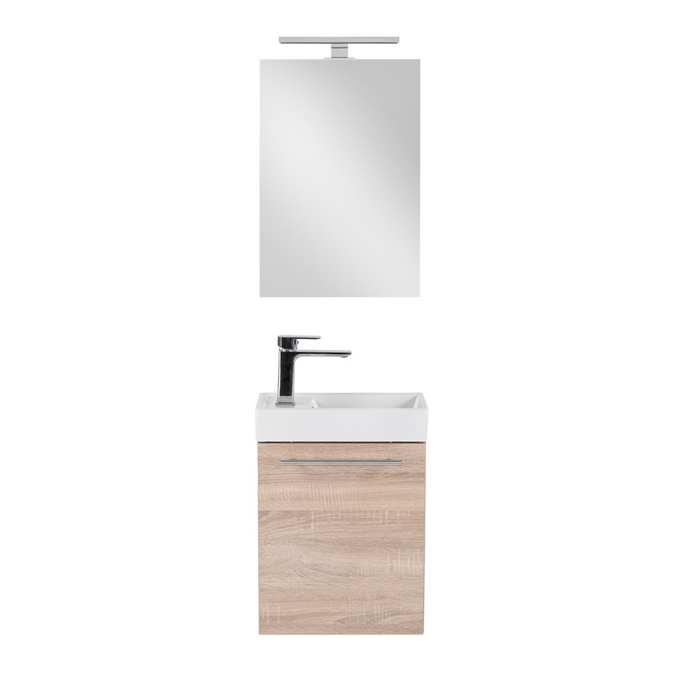 Kis helyigényű minőségi fürdőszoba bútor kisebb fürdőszobákba, vagy mellékhelyiségbe tökéletes kézmosónak. A termék kiváló minőségű bútorlapból készül és színben passzoló élzárókkal van ellátva. A fürdőszoba bútor felfüggesztett kivitelben kapható. A mosdó fehér öntött márvány.