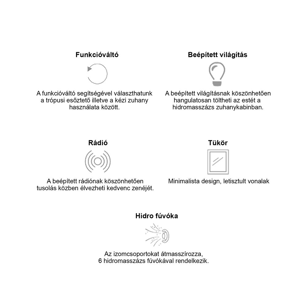 Az Aria zuhanykabin számos hasznos funkcióval rendelkezik. Pipere polccal van felszerelve, melynek köszönhetően rendbe tudja tartani a tisztálkodáshoz szükséges eszközeit. Trópusi esőztetővel és kézi zuhannyal is rendelkezik, melyet a funkcióváltóval tud váltakoztatni. A víz hőmérsékletét a keverő csapteleppel tudja beállítani. A trópusi esőztető mellett helyezkedik el kettő szellőző, melyeknek köszönhetően távozik a felesleges meleg gőz ezzel megakadályozva a kabin párásodását. A kabinba 6 db hidromasszázs fúvóka van beszerelve, rádió és egy felhajtható ülőke melyek biztosítják az extra kényelmet. Ezeken kívűl felső világítás és tükör is van a kabinban.