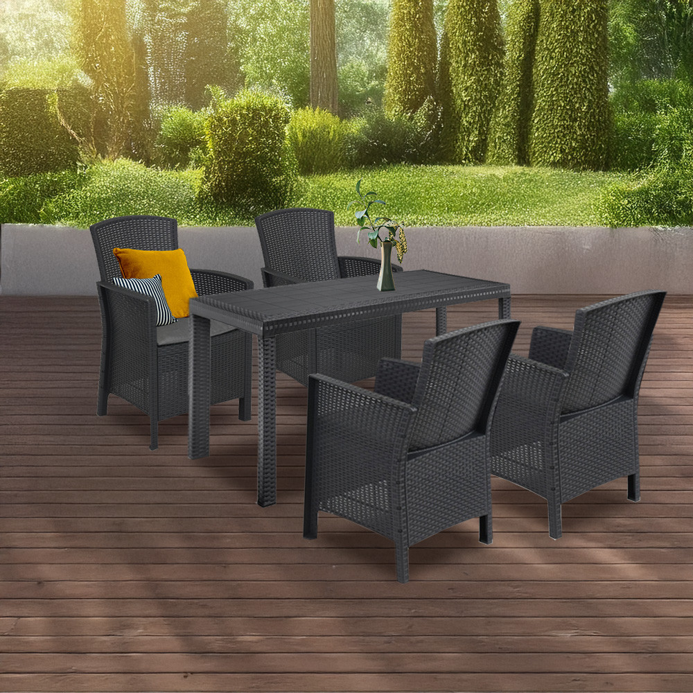Ez a 4 személyes kerti bútor szett megfelelő kényelmet nyújt a teraszon vagy a kertben való pihenéshez. Élvezheted a napsütést a barátaid vagy a családod társaságában, akár egy gyors kávézás vagy akár egy egész napos grill parti keretein belül, a kerted kényelmében. Az asztal nagy mérete miatt sok minden elfér rajta ezért akár ez a kerti bútor szett a második étkeződ lehet, így a természetben fogyaszthatod el az ebédet egy nyári napon, számodra kedves emberek társaságában. Nagyszerű választás, ha szeretsz a szabad levegőn pihenni és olvasgatni.
