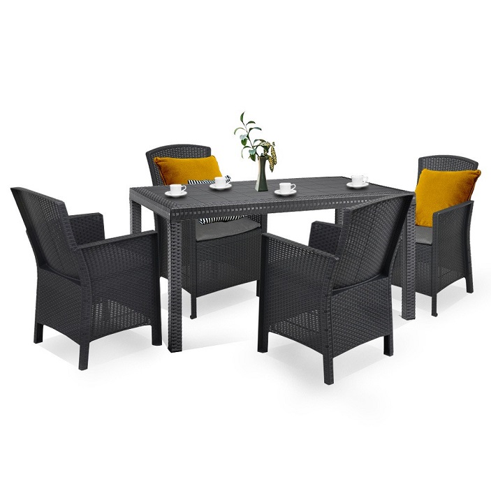 Ez a grafit színű, kényelmes és elegáns Hellma bútor szett négy 60 x 56 x 90 cm-es fotelt és egy 90x 150x 74 cm-es négyszögletes magas asztalt foglal magába. Anyagából eredően könnyű tisztítani és mozgatni, ezért bármikor oda teheted ahol éppen szükség van rá, de mégis nagyon stabil és kényelmes ülőhelyet biztosít.