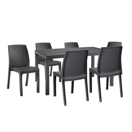 Olaszországban készült ez a grafit színű, kényelmes és elegáns bútor szett. Hat 47x 59x 86 cm-es széket és egy 150x 90x 74 cm-es négyszögletes magas asztalt foglal magába. Méretén és kényelmén kívül kedvező lehet, hogy összeszerelése nem igényel szakmai tudást és könnyen mozgatható, így mindig oda teheted ahol éppen szükséged van rá.