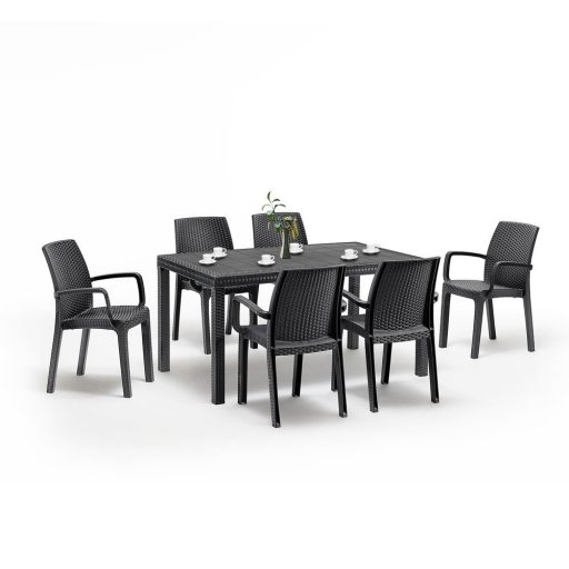 Olaszországban készült ez a grafit színű, kényelmes és elegáns bútor szett. Hat 57x 59x 86 cm-es karfás széket és egy 150x 90x 74 cm-es négyszögletes magas asztalt foglal magába. Méretén és kényelmén kívül kedvező lehet, hogy összeszerelése nem igényel szakmai tudást és könnyen mozgatható, így mindig oda teheted, ahol éppen szükséged van rá.