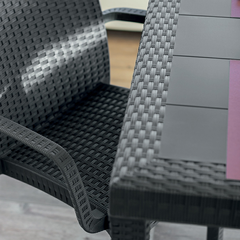 Strapabíró anyaga: UV sugárzásnak és az időjárás viszontagságainak ellenálló műanyagból készült. A bútor szett ideálisan beleillik minden ház körüli térbe, ahol ideális helyet teremt a szabad levegőn való pihenéshez. Természetes rattan fonással inspirált felülete a termék esztétikai előnyei közé sorolható.