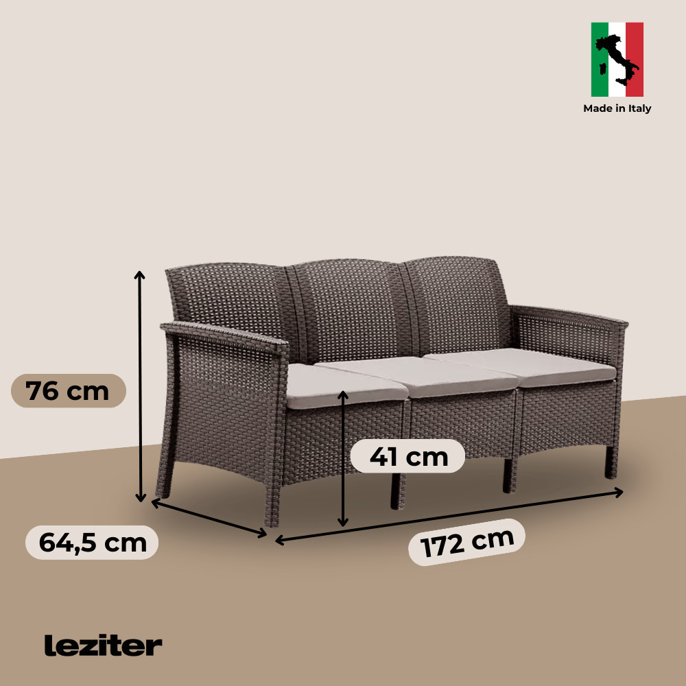 Ez az olasz gyártmányú, barna színű, kényelmes és elegáns bútor szett két 63 x 64,5 x 76 cm-es fotelt, egy 117 x 64,5 x 76 cm-es két személyes kanapét, egy 172 x 64,5 x 76 cm-es három személyes kanapét és egy 60 x 54,5 x 40,5 cm-es négyszögletes asztalt foglal magába. Ez a 7 személyes kerti bútor szett rendkívül előnyös lehet, ha szeretnéd kiélvezni a szabadban eltöltött időt barátaiddal vagy családoddal.