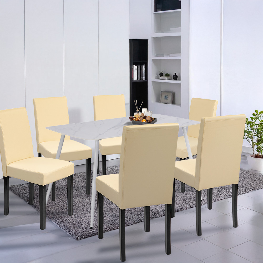 A garnitúra része hat darab Leziter Kelly szék, amelyek bézs ECO bőr kárpitozásuknak köszönhetően nemcsak elegánsak, hanem rendkívül könnyen tisztíthatók is. A vastag, 4 cm-es habszivacs ülőfelület kényelmet biztosít akár egy hosszabb vacsora során is, a stabil fenyőfa lábak pedig 120 kg-os teherbírásukkal még intenzív használat esetén is megbízható társak maradnak.