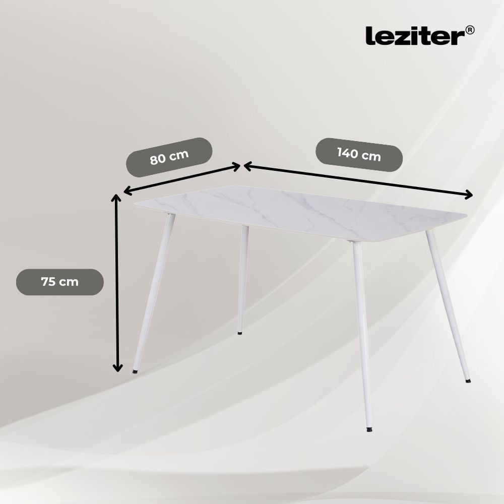 A Jenna étkezőgarnitúra szíve a Leziter Bora 140 cm-es szögletes étkezőasztal, amely a modern otthonok egyik legpraktikusabb és legstílusosabb bútordarabja. A különleges szinterezett kő asztallap természetes anyagok – agyag és homok – felhasználásával, extrém nyomáson és hőfokon készült, így páratlanul ellenálló felületet biztosít. Ez a palakő hatású, világosszürke textúrával készült asztallap ellenáll a hőnek, a karcoknak és a foltoknak, így nem kell többé féltened a felületet a mindennapi használattól.
