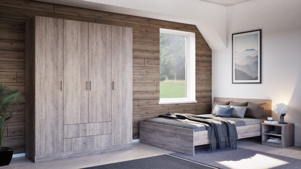 | Anyag | Kiváló minőségű bútorlap, yorki tölgy oldallappal, yorki tölgy fejvéggel és ágyvéggel. |