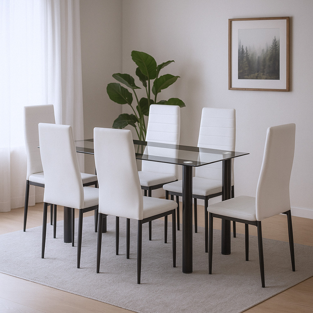 A fehér-fekete színkombináció remekül harmonizál a füstszürke üvegasztal színvilágával, így a teljes szett vizuálisan is egységes és kiegyensúlyozott.