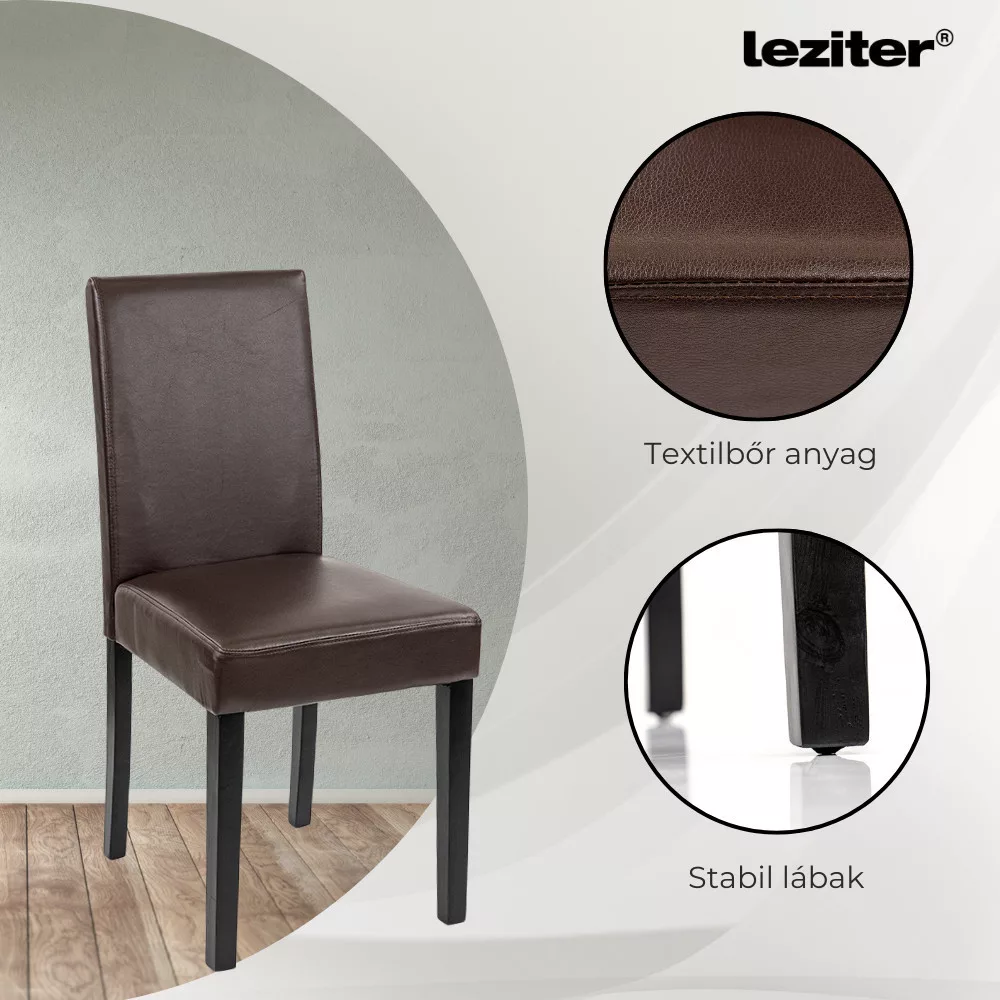 A Leziter Kelly székek extra kényelmet biztosítanak minden étkezés során. A barna ECO bőr borítás letisztult és elegáns, ráadásul könnyen tisztítható, így ideális választás családoknak, éttermeknek vagy irodai terekbe. Az ülőfelület újrahasznosított habszivacsból készül, amely nemcsak kényelmes, hanem környezetbarát megoldás is. A masszív fenyőfa lábak biztonságot és tartósságot nyújtanak.